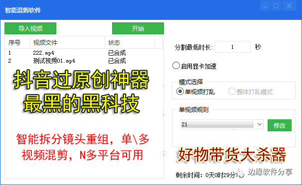 二、智能混剪部分,监控采集软件的输出文件夹,发现有采集下来的视频,就对视频进行智能混剪操作,完成后输出到另一文件夹中,实测本软件处理的带货视频过抖音原创检测杠杠滴