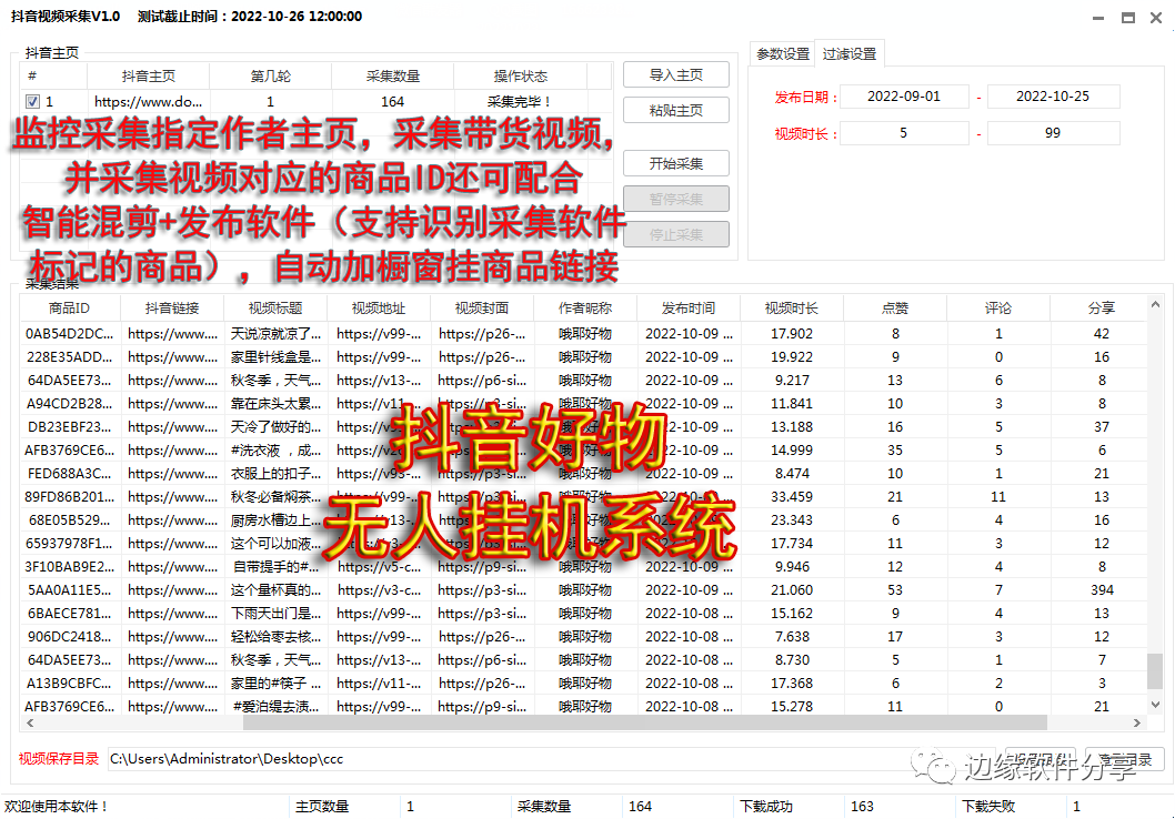 一,监控采集部分,可以对批量主页进行监控采集,采集该主页预设日期内的带货视频,同时把带货视频中挂载的商品链接保存下来